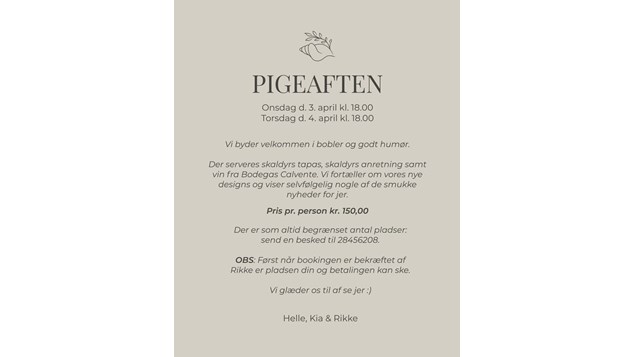 UDSOLGT BEGGE DAGE‼️ (I er for vilde, det går bare stærkt) Vi gør det igen, inviterer til pigeaften i Skaldyrshuset Onsdag d. 3. April kl. 18.00 Torsdag d. 4. April kl. 18.00 Vi byder velkommen i ...